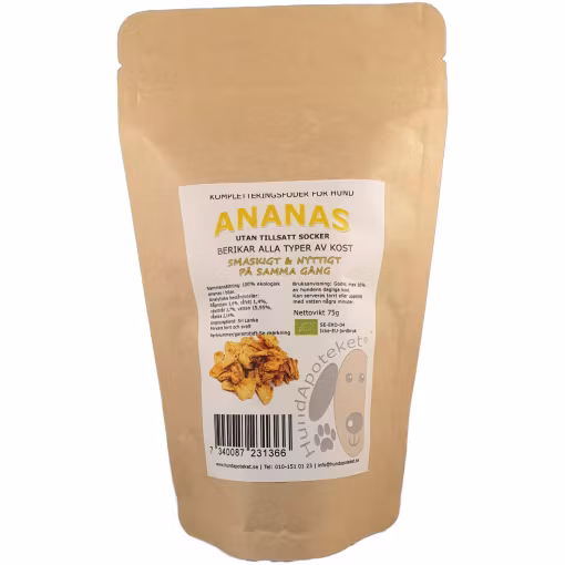 I torkad ananas är näringen koncentrerad och därför bör man inte ge mer än 10 gram per 10 kg kroppsvikt och dag.