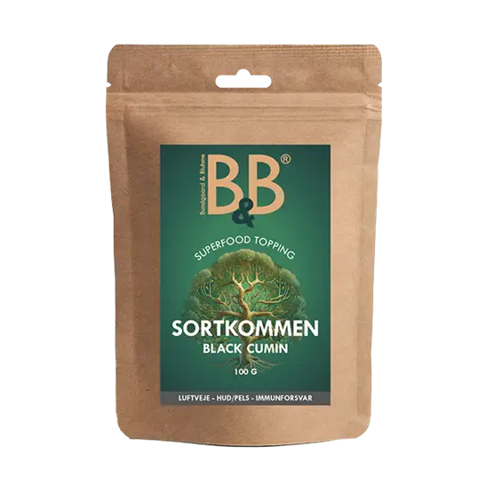 SVARTKUMMIN - Luftvägar/Hud/Päls/Pigment Svartkummin har i århundraden varit känd som en insektsavskräckande, stärkande och balanserande ört. I pulverform är det lätt att använda som topping på hundens dagliga foder – och samtidigt är det en naturlig källa till värdefulla näringsämnen. Det är likaså en naturlig källa till nyttiga fettsyror, då det innehåller både omega 6 och en mindre mängd omega-3. Dessutom är det rikt på mineraler och viktiga aminosyror. Bland annat zink och magnesium, som tillsammans kan bidra till sund hud, päls och cellernas funktion. Svartkummin är fint pulveriserade svartkumminfrön av Nigella Sativa, som har ett högt innehåll av omega 6 fettsyror, antioxidanter, zink, magnesium, aminosyror för en sund ämnesomsättning och vitalitet. Nigellaolja innehåller en rad aktiva ämnen bland annat Thymoquinon, som kan bidra till att stärka hundens immunsystem och kan ha en positiv inverkan på luftvägsutmaningar. Det unika innehållet av Thymoquinon och essentiella fettsyror, bidrar till hudens hälsa och kan hjälpa till att ge en vackrare och glänsande päls. Denna superfood är särskilt känd för att ha en effektiv avskräckande verkan på fästingar och loppor. Lätt att dosera. Pulvret strös över hundens mat som topping Rent och naturligt, utan konstgjorda tillsatser Innehåll 100 g.