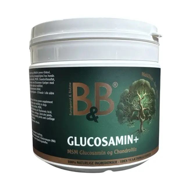 B&B Glucosamine+ är ett skonsamt och effektivt kosttillskott utvecklat för att stödja friska leder och god rörlighet hos hundar. Produkten innehåller glukosaminsulfat, MSM, kondroitinsulfat, boswellia, nypon och hyaluronsyra, vilka tillsammans kan hjälpa till att stärka lederna och främja optimal rörlighet. Naturliga ingredienser med dokumenterad effekt. Naturligt stöd för din hunds leder, rörlighet och livskvalitet. Utvecklat i Danmark med fokus på kvalitet och funktion. 100 % naturliga ingredienser – utan tillsatser. Lätt att dosera och blanda i maten. Hos B&B kallar vi Glucosamine+ för kroppens egen riktade mekaniker. 1 tesked (4 g) innehåller: MSM: 1 200 mg, glukosaminsulfat: 1 200 mg, kondroitinsulfat: 400 mg, boswellia: 200 mg, hyaluronsyra: 40 mg.