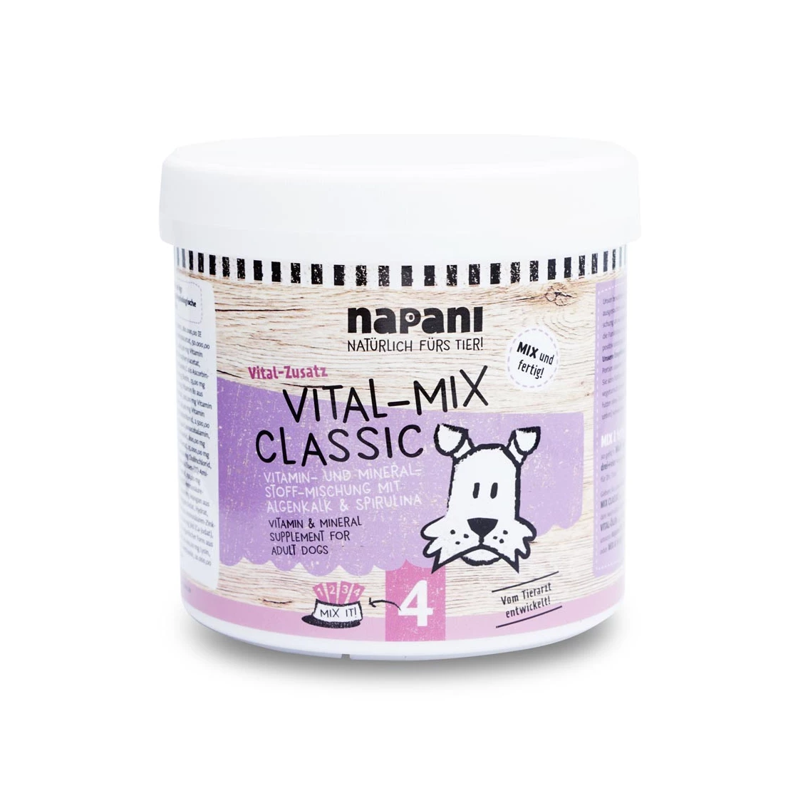 Vår Vital-Mix Classic ger din hund alla viktiga mineraler och vitaminer. Tillsammans med våra högkvalitativa eteriska oljor blir våra menyer (utan mineraltillsatser) och vår baslivsmat med rent kött ett komplett foder. Blandningen ger din hund viktiga mikronäringsämnen såsom spårämnen, vitaminer och mineraler.