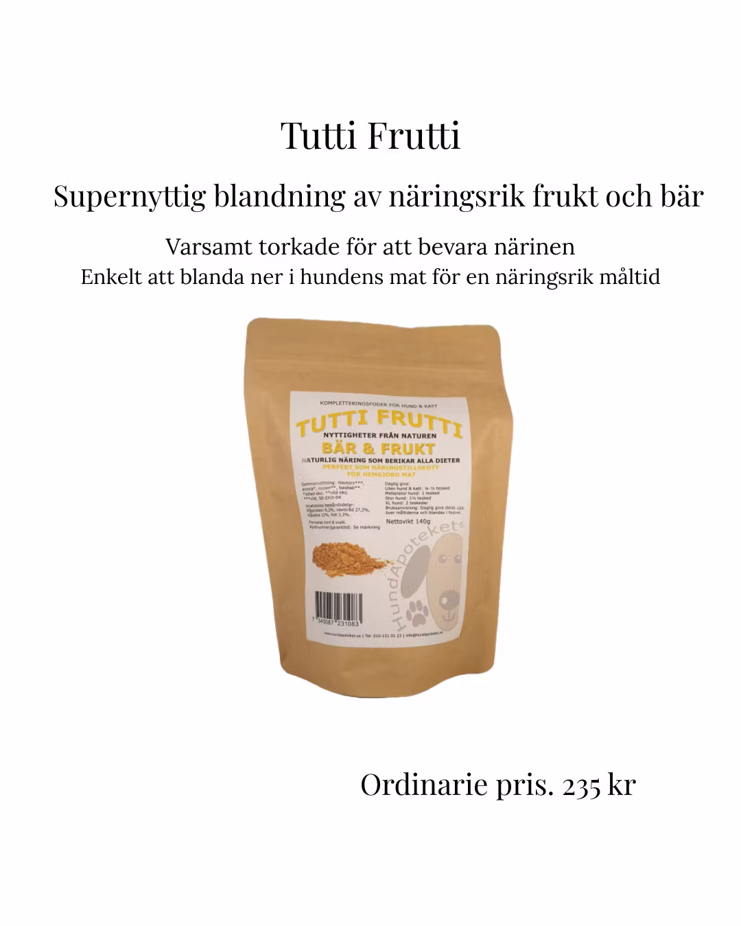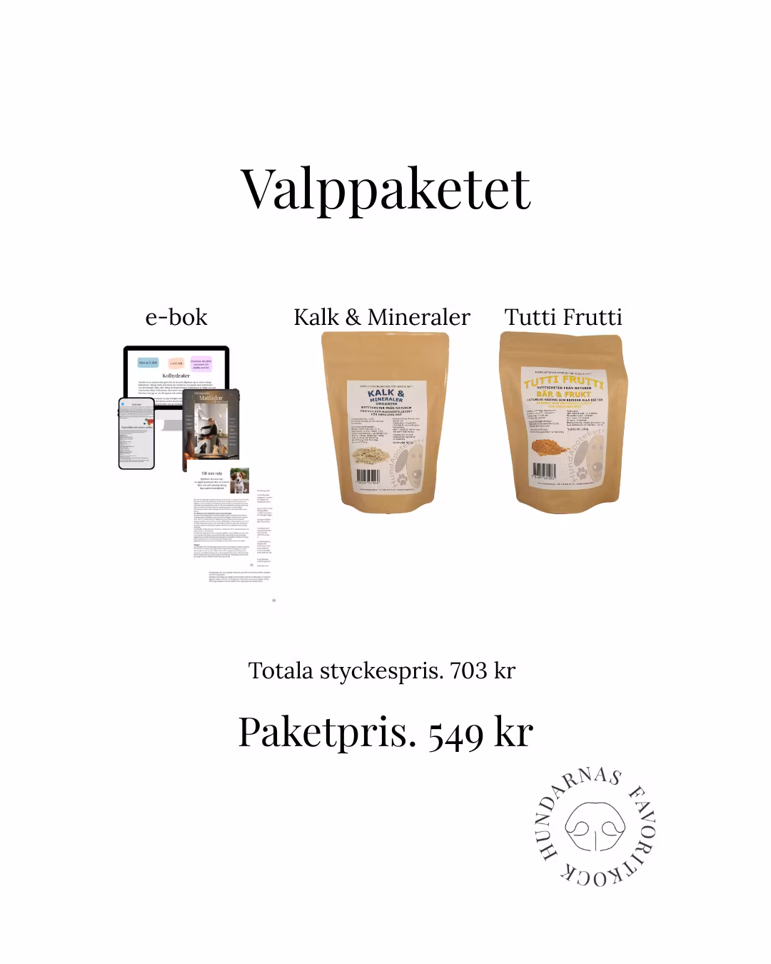 Valppaketet är en bra grund när man ska planera och ge sin valp näringsrika måltider. I valppaketet ingår e-boken Näringsrika matlådor till din hund där du lär dig grunderna för en näringsrik kost. boken innehåller det du behöver veta för att komma igång med att komponera egen mat till valpen (hunden), varav ett kapitel är speciellt för just valptiden. Kalk & Mineraler är något alla hundar behöver för att bygga och bibehålla ett starkt skelett, särskilt viktigt är det för den växande valpen. Tutti Frutti innehåller näringstäta frukter och bär som är varsamt torkade för att behålla sina naturliga näringsämnen. det näringsrika pulvret blandas ner i hundens mat. Att ge hunden mat som är så lite processad som möjligt ger en friskare och gladare hund. Immunförsvaret grundar sig till störst del i tarmen. En rik tarmflora ger friskare hundar.