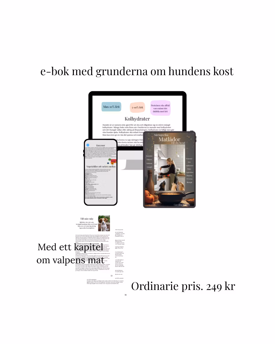 Valppaketet är en bra grund när man ska planera och ge sin valp näringsrika måltider. I valppaketet ingår e-boken Näringsrika matlådor till din hund där du lär