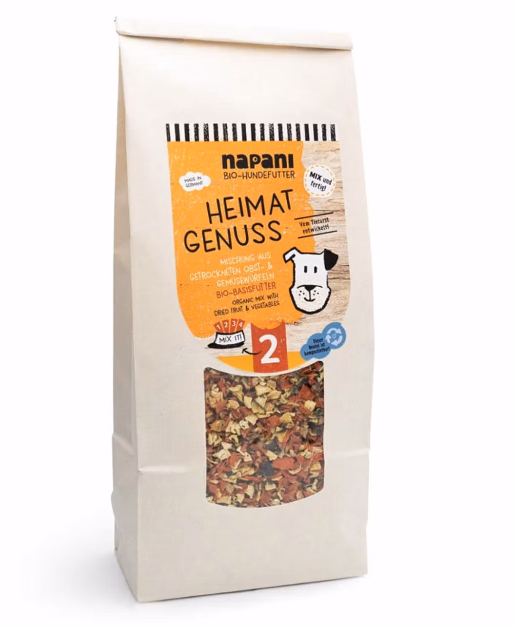 BeskrivningVår ekologiska frukt- och grönsaksblandning ”Heimat Genuss” är ett nyttigt tillskott till en balanserad hundmeny. Efter att ha svällt i varmt vatten