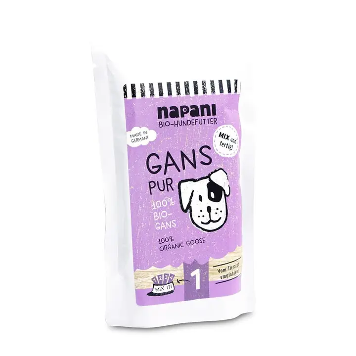Från vårt sortiment av rent kött – ren ekologisk gås, precis som i naturen! Tillverkad med största omsorg och de bästa ingredienserna. På Napani värnar vi också om bra mat för oss själva, så det är självklart att våra djur endast får den bästa maten i sina skålar för deras hälsas skull. - Från helt ekologisk odling - Varsamt tillagad, naturligtvis - Producerad på ett CO²-neutralt sätt - Passar även känsliga magar - Monoprotein - Fri från färgämnen, smakförstärkare och fyllnadsmedel Sammansättning: 100 % ekologisk gås (90 % muskelkött, 5 % halsar, 5 % skrottar)