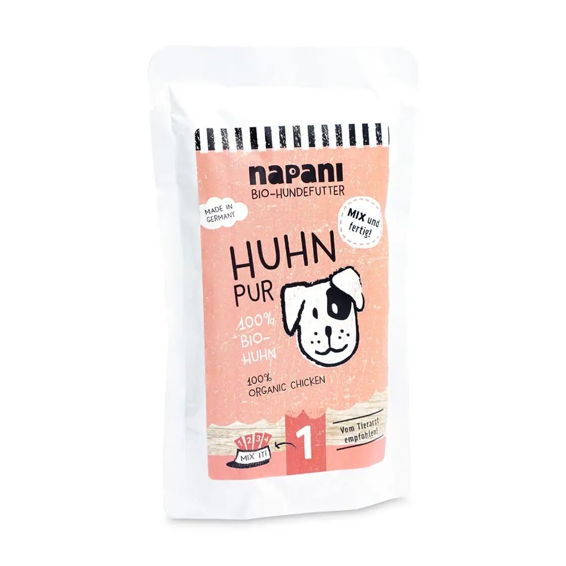 Från vårt sortiment av ren köttmat – ren ekologisk kyckling, precis som i naturen! Den är omsorgsfullt tillagad med de bästa ingredienserna. På Napani värnar vi även om god kvalitet för oss själva, så det är självklart att våra djur bara får den bästa maten i sina skålar för deras hälsas skull. - Från enbart ekologisk odling - Skonsamt tillagad - Producerad på ett koldioxidneutralt sätt - Lämplig även för magkänsliga hundar - Monoprotein - Fri från färgämnen, smakämnen och fyllmedel Sammansättning: 100 % ekologisk kyckling (90 % muskelkött, 5 % halsar, 5 % hudar) Individuella fodermedel Analytiska beståndsdelar: Råprotein 11,0 % Råfett 3,1 % Råfiber 0,3 % Råaska 4,0 % Fuktighet 81,3 % Kalium 0,22 % Kalcium 1,27 % Fosfor 0,69 % Natrium 0,07 % Magnesium 0,04 %